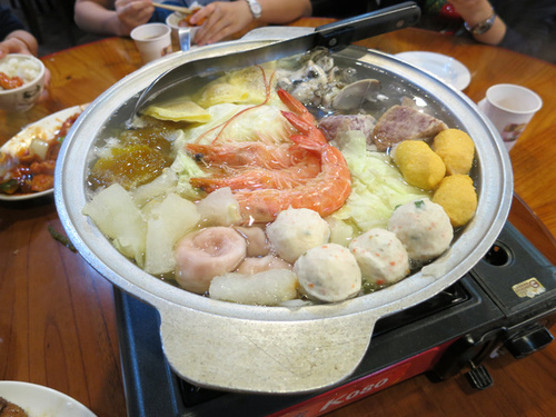 “乍看”很蓬派的海鮮火鍋,後來發現鋪在上層就是所有的火鍋料了,下面全是蔬菜,這鍋上桌時才叔正好去講電話,不知情的大家不小心把上頭的料撈光光,才叔回來後只好喝菜湯。